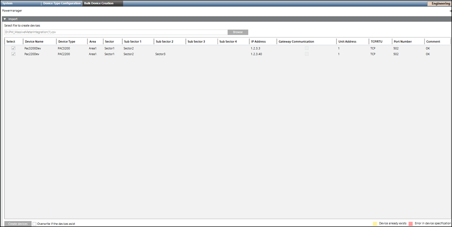 NOTE: If the device is already present in the system, it is highlighted in yellow. If there is an error in the device specification, the device is highlighted in red.