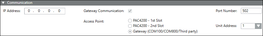 Gateway Communication: By default, this check box is selected, setting the Access Point to the Gateway (COM100/COM800/ThirdParty).