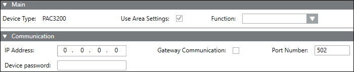 IP Address: Specify the IP address of the device for communication. When communicating via a gateway, use the IP address of the higher level. When communicating via Modbus TCP, use the IP address of the device.