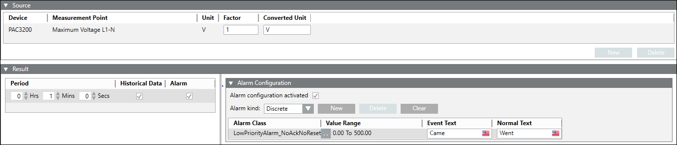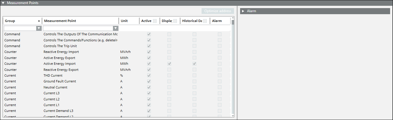 Alarm configuration activated: Select this checkbox to activate the alarm for the corresponding measuring point.