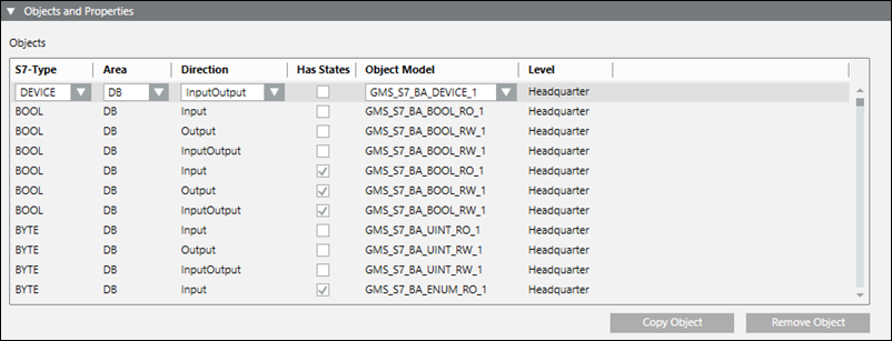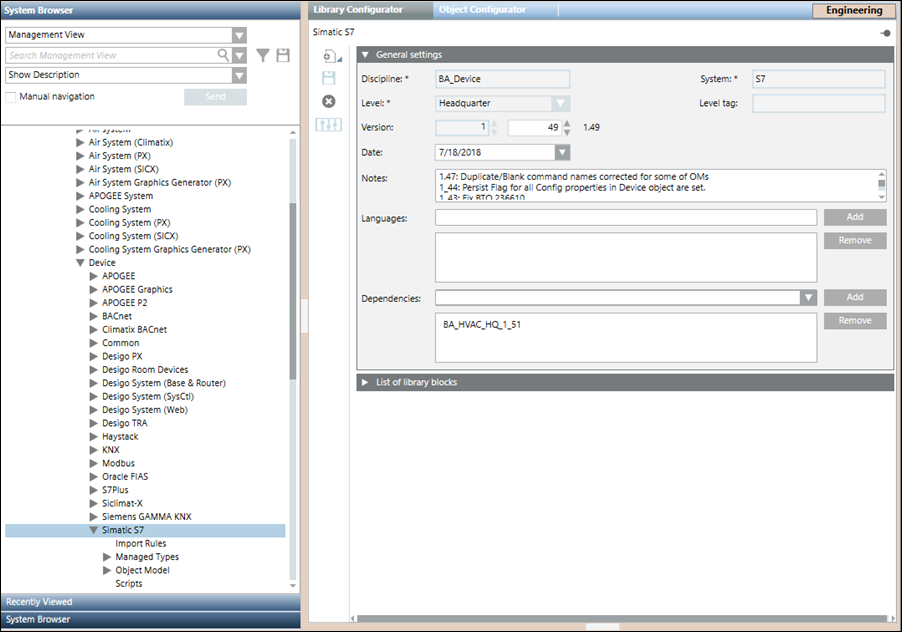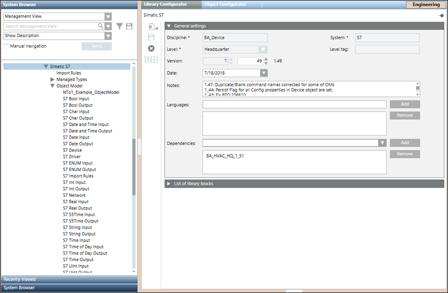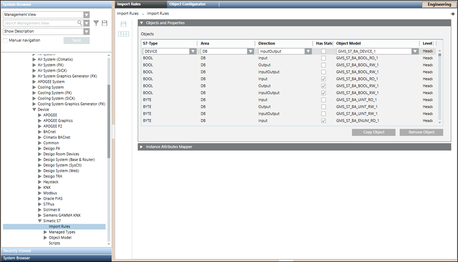 The S7 Data Point Types (DPTs) and the standard object models are imported under the Object Model library at the following location in the Engineering mode, Management View > System Settings > Libraries > BA HQ > Devices > […] > Object Model.