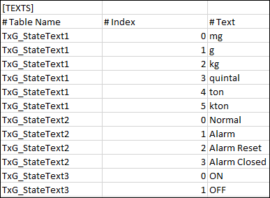 - Using the text group name starting with "TxG_S7_PRJ", the converter will create entries into the [TEXTS] section. Using the preceding example, the text group name will be “TxG_S7_PRJ _State1_State2_State3” and the entries will be as follows: