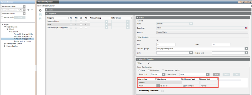 - UpperHysteresis: The upper range for the alarm value; beyond which alarms will be generated.