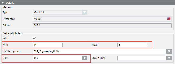 The Min, Max, and Unit fields can be set for values of type INT, UINT, REAL.