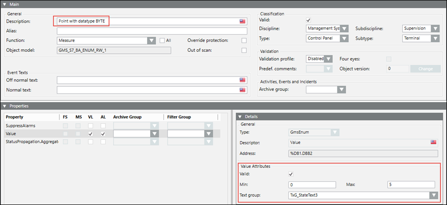Since a Boolean point can have a maximum of two states, the text group also has two states. These two states correspond to the two value range of Minimum and Maximum. After the CSV import, the Details expander displays as follows: