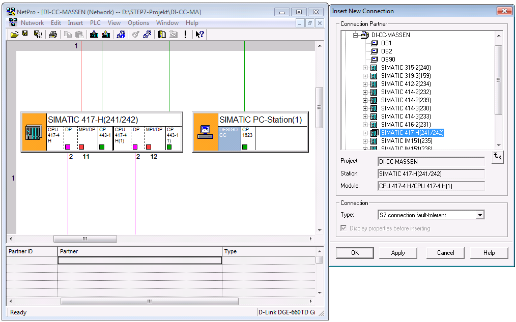 - Configure the fault-tolerant connection between the S7400H-machine and the SIMATIC PC-Station.