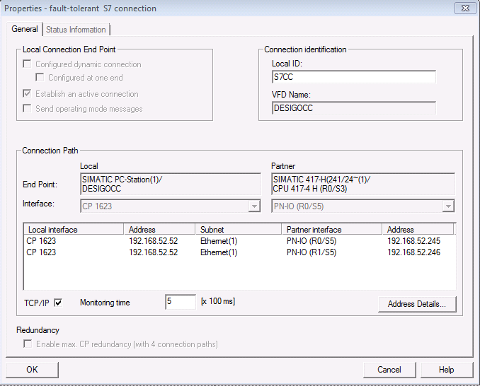 NOTE: The state of the fault-tolerant connection can be checked on the SIMATIC PC-Station under S7 Connection Diagnostics.