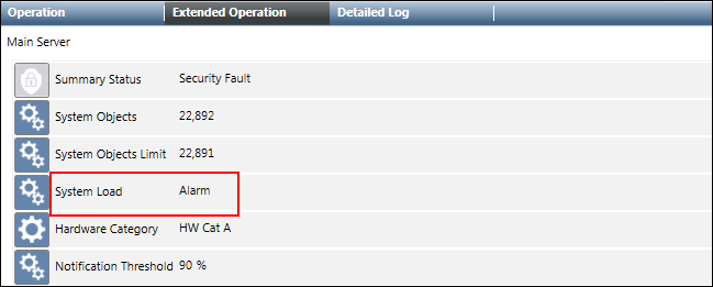 - If the number of S7 PLUS objects is between the system limits (defined by the System Objects Limit property) and the safety threshold (defined by the Notification Threshold property), then the System Load property indicates Warning and displays in the Extended Operation tab.