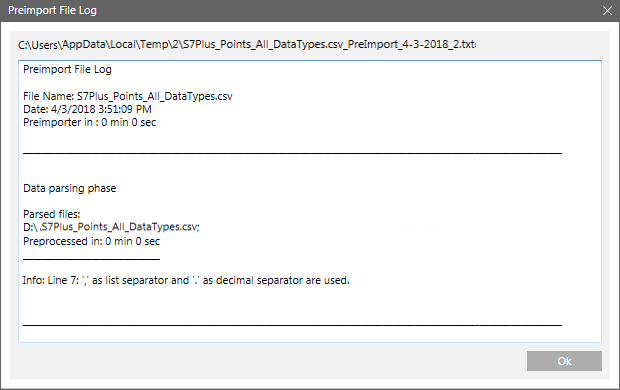 Analysis Log | Displays the Preimport File Log dialog box with the errors encountered during pre-processing phase of the csv file. NOTE: |