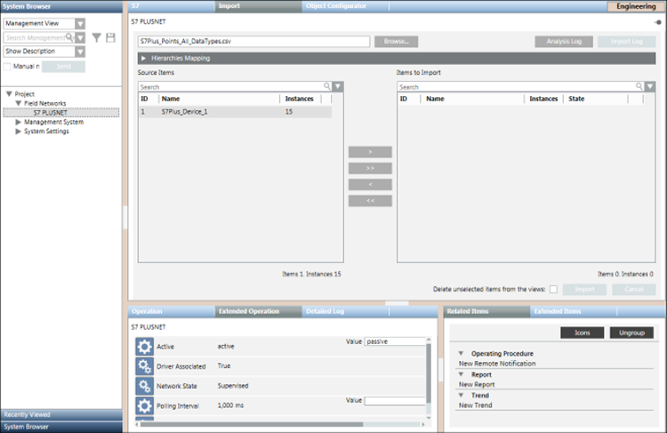 The S7 PLUS Importer allows you to manage the import of field data (engineering objects) described in the S7 PLUS csv file.