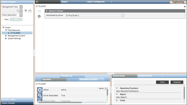 The S7 PLUS network workspace allows you to configure the network settings such as associating the S7 PLUS driver to the network, saving the association, and deleting the network. The properties associated with the selected network display in the Operation tab or Extended Operation tab. You can also change the value of the poll interval. By default, this value is set to 0 ms.