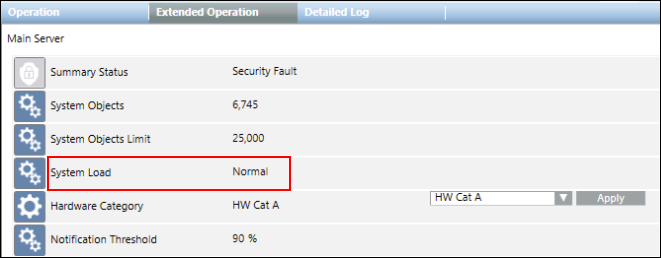 If the number of S7 PLUS objects is below both the system limits (defined by the System Objects Limit property) and the safety threshold (defined by the Notification Threshold property), then the System Load property indicates Normal and displays in the Extended Operation tab only.