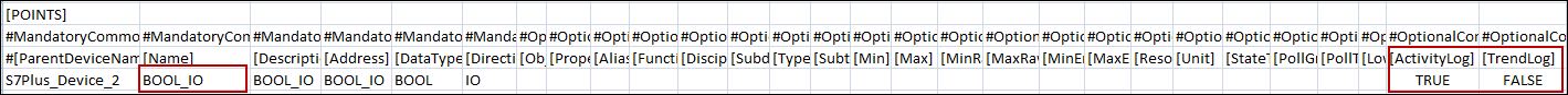 ActivityLog | Status of the AL flag for the point. The possible values are: FALSE or 0 – Turns OFF the AL flag for the point on importing the CSV. NOTE: If no value is specified in this field, then the current state of the point will be retained on re-importing the CSV file. |