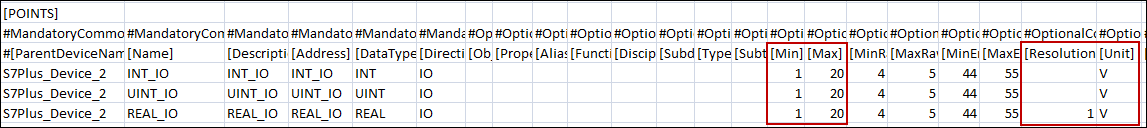 The Min, Max, Resolution, Unit data in the CSV can be configured as follows: