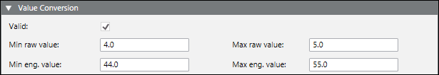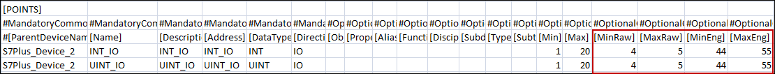The Min Raw, Max Raw, Min Eng, and Max Eng data in the CSV can be configured as follows:
