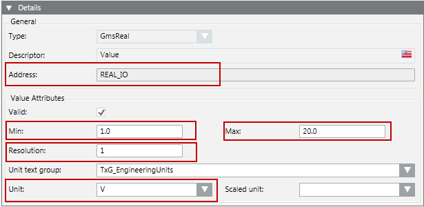 The Min, Max, and Unit fields can be set for values of type INT, UINT, REAL.