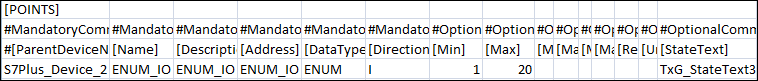 DataType1) | Data type of the S7 PLUS point. For Standard Object Model import, it is a CSV datatype. It is used along with [Direction] to derive the Transformation Type and standard object model of a point using import rules. Valid CSV datatypes include, Bool, Byte, Word, DWord, USint, UInt, UDInt, SInt, Int, DInt, Real, Date, DateTime, Time, TOD, S5Time, String, WString, ENUM. For N to 1 mapping, it is the Transformation Type (datatype of the property on the device). Valid transformation types include, Bool, Byte, Word, DWord, USint, UInt, UDInt, SInt, Int, DInt, Real, Date, DateTime, Time, TOD, S5Time, String, WString. |