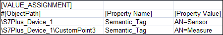 In order to create instances of S7 PLUS devices, you must create the engineering data in the form of a comma-separated value (CSV) file. A CSV file contains data in which values are represented as text and separated using a separator such as comma (,). The file in the CSV format can be edited in text editors such as Wordpad or Notepad. More elaborate editing can be done using advanced word processing tools, like Excel. A CSV file is divided into the following sections.
