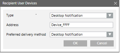 In above image(Configuring Recipients for Desktop Notification), the second column shows the device ID of a computer running the Alertus client. When configuring this device ID in the Address field in the Recipient User Devices section, add the prefix “Device_” to the ID. For example, if theDevice ID is FFFF then configure in address field as Device_FFFF.