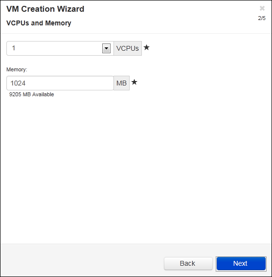 1. On the vCPUs and Memory page, enter the number of vCPUs and the amount of Memory to assign to the VM. For more information, see Planning Virtual Machine vCPUs and Planning Virtual Machine Memory. To continue, click Next.