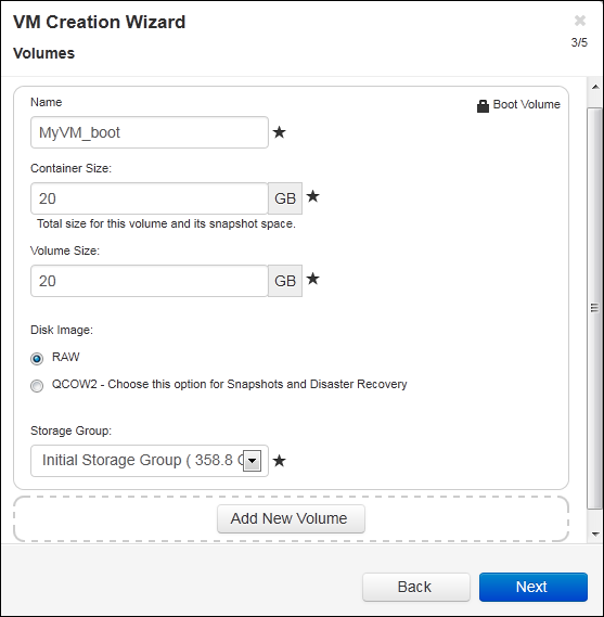 • If applicable, create additional data volumes by clicking Add New Volume and specifying the parameters for each volume. (You can also add volumes after you create the VM by using the Reprovision Virtual Machine wizard, as described in Creating a Volume in a Virtual Machine.)