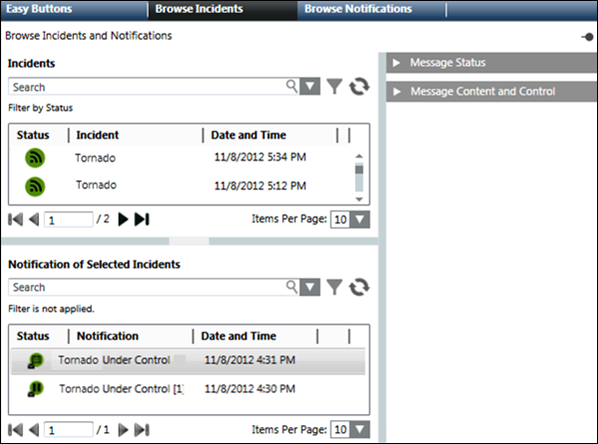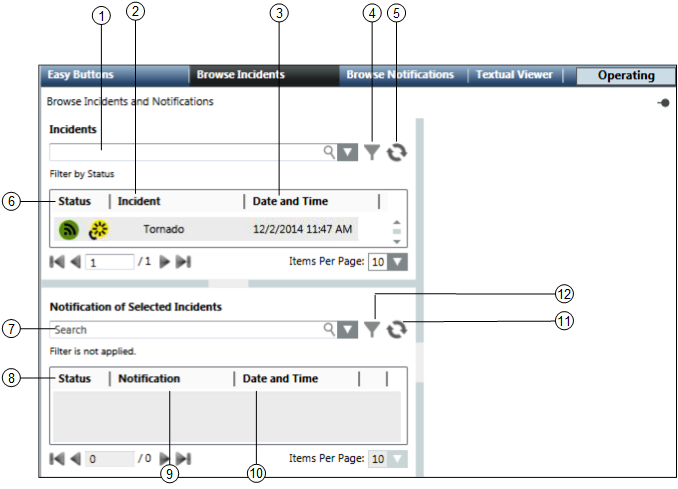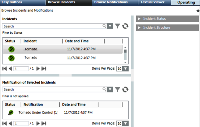 The Browse Incidents tab displays in Operating mode when you select Applications > Notification in the Application View from the System Browser.