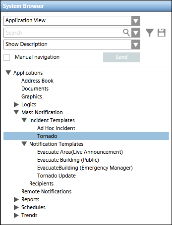 - Notification template: For message templates that are part of an incident template, this field allows users to select a targeted notification template from the drop-down list. Alternatively, the user may drag and drop a stand-alone notification template from the System Browser hierarchy to configure the targeted notification template.