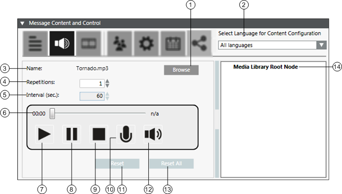 - Reset All: Resets the multimedia files content (multimedia file, repetitions, interval (sec) fields) configured for all languages.