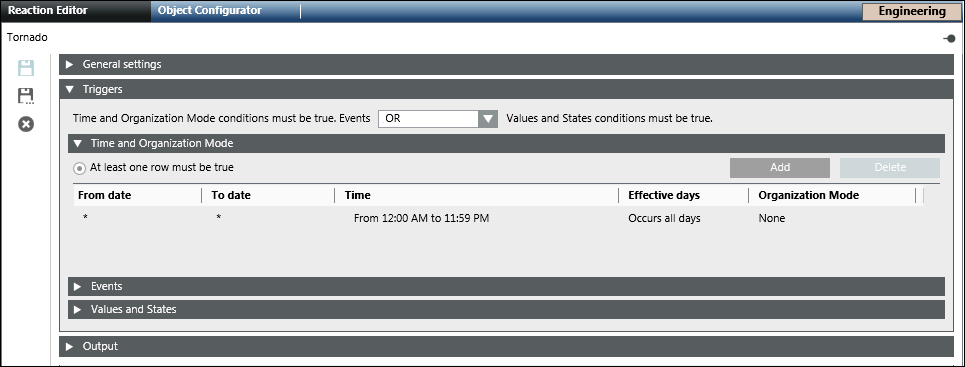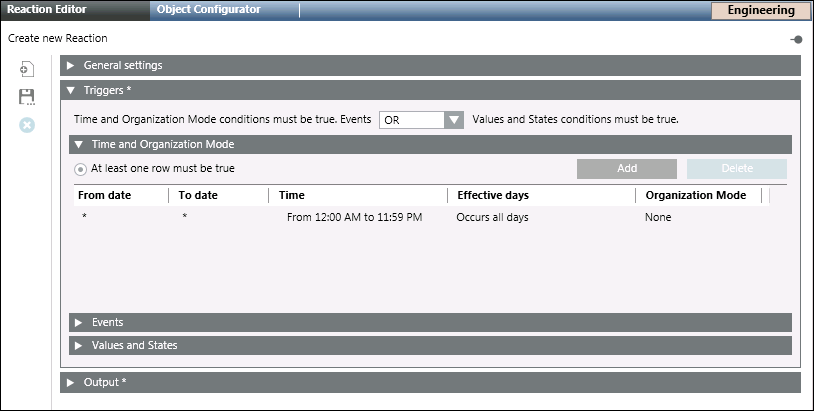 - In the Triggers expander, specify if the conditions specified in both Events as well as Values and States expanders must be true or if the conditions specified in either of the expanders must be true by selecting the appropriate operator (AND, OR) in the drop-down list.