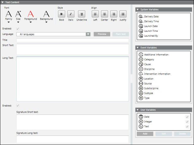 The signatures are displayed in the Short Text and Long Text fields in the Message Content field. Alternatively, click the Preview button to view a sample of how the signature displays with the long and short text.