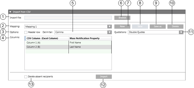 - Columns: For the selected mapping, defines the mapping of CSV columns to recipient user properties This feature allows you to create or update a CSV import mapping by allowing you to select a CSV column (Column 1 - Column 30) and then select a Notification property that the selected CSV column will be mapped to during the import.
