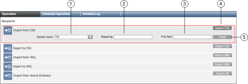- Import: Starts the recipient user import from the selected CSV file based on the configured mapping.