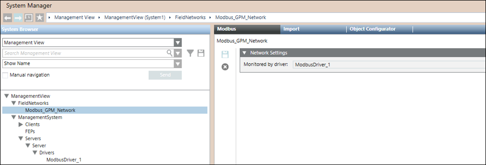 - Create the Modbus Network and associate it with the Modbus driver. (See Modbus).