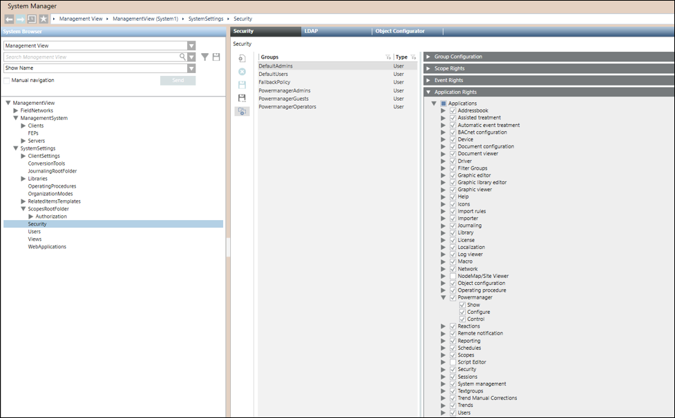- Ensure that you have configured a user group and assigned Scope rights (See Assign Scope to a User Group in Security) and application rights (See Verify Powermanager Application Rights in Additional Powermanager Procedures) to the user group using the Security tab that displays when you select Project > System Settings > Security in the System Browser in the Engineering mode.